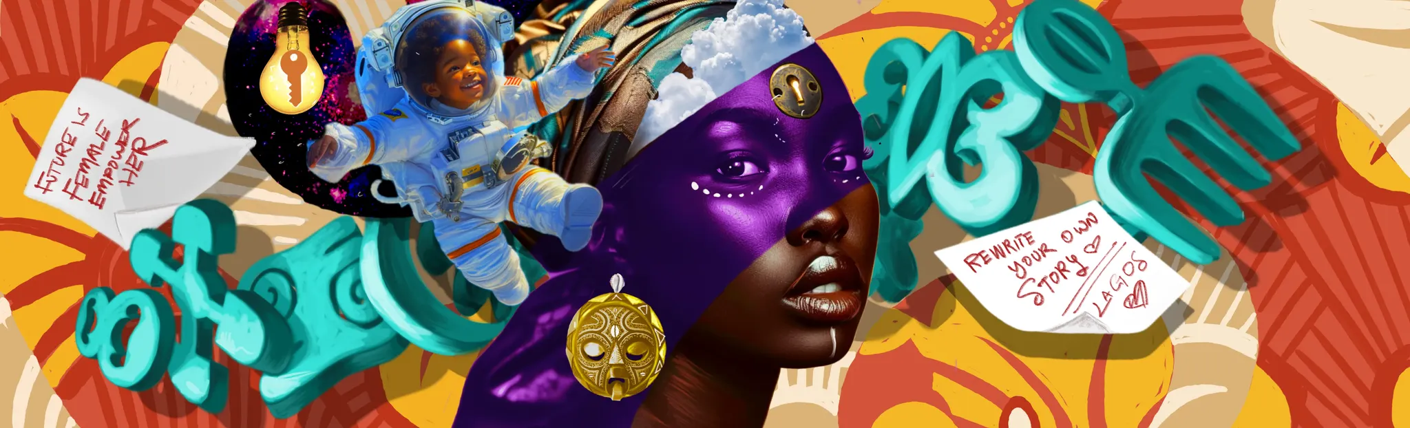 A warm tapestry of African textile patterns—reds, oranges, and yellows—grounds the futuristic imagery in tradition, while blue graffiti strokes bring the pulse of contemporary African street culture. Together, these layers form a dynamic visual language honoring women as carriers of light, catalysts of innovation, and writers of new narratives.