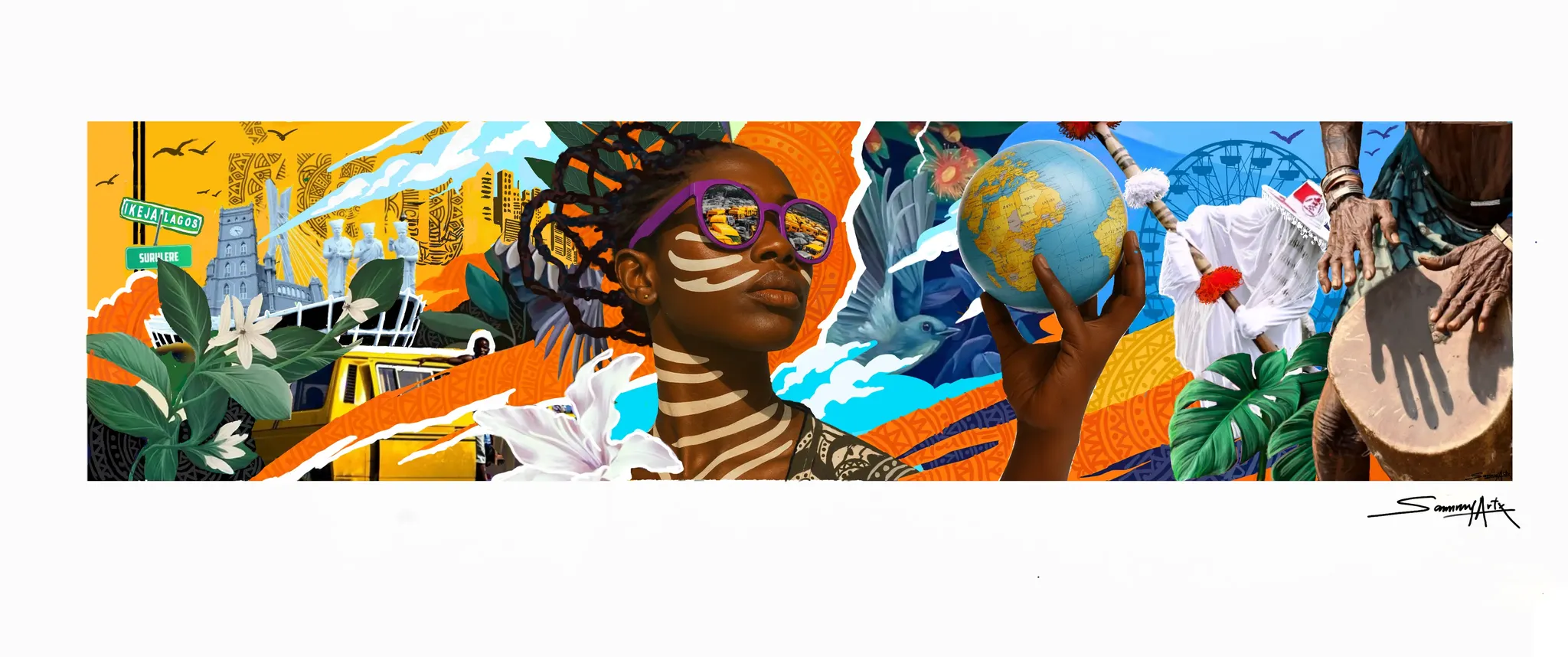 The iconic Eyo masquerade stands as a guardian of heritage, while bold cultural patterns and the Lagos skyline anchor the piece in the city’s unmistakable identity. At the center, a radiant figure lifts the globe, symbolizing Lagos’ expanding influence and its creative force stretching beyond borders. This character—born from digital illustration and not modeled on any real person—represents the collective spirit of Lagosians rather than an individual likeness.